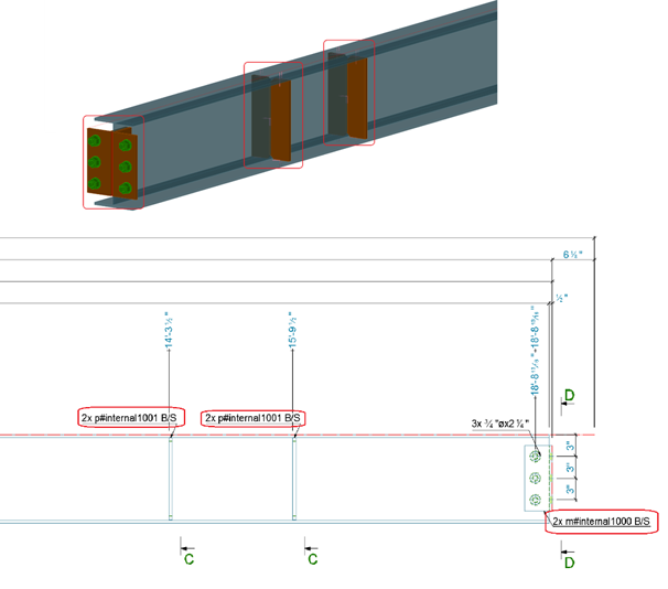 When labels were created on overlapping elements that are also identical, Advance Steel would automatically add a quantity value in the label, showing the total quantity of elements in that location. As seen in the example below, even if on the Front view of an assembly drawing, Advance Steel will draw lines from only one stiffener (all of the lines of the other stiffener are perfectly overlapping and behind the front one), the label quantity is present.