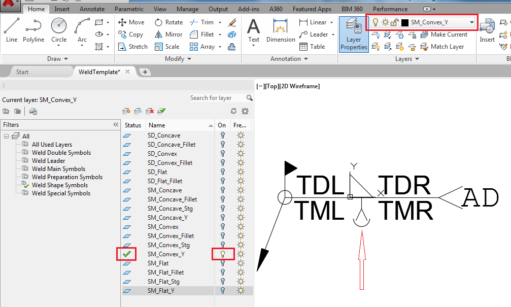 Note: Starting with Advance Steel 2016, each weld symbol has its own layer.