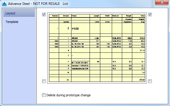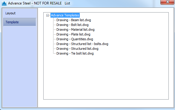 This tab lists all available templates. By default, the templates are installed in ...\ProgramData\Autodesk\Advance Steel 2024\[INSTALLATION LANGUAGE EXTENSION]\Shared\Support\BOMTemplates\.