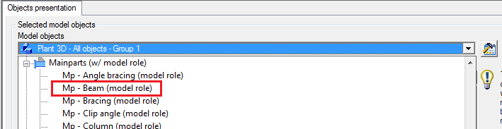 Model object: This option will control what object from your model will be detailed by this specific line. Part of this configuration is to match specific model roles - those model objects need to be selected to match the object type (beam, plate, etc) and the model role. Search through the list and select the required model role. The out-of-the-box Advance Steel provides a wide series of pre-configured model objects. The model object for beams with the Beam model role exists and it is named Mp - Beam (model role).