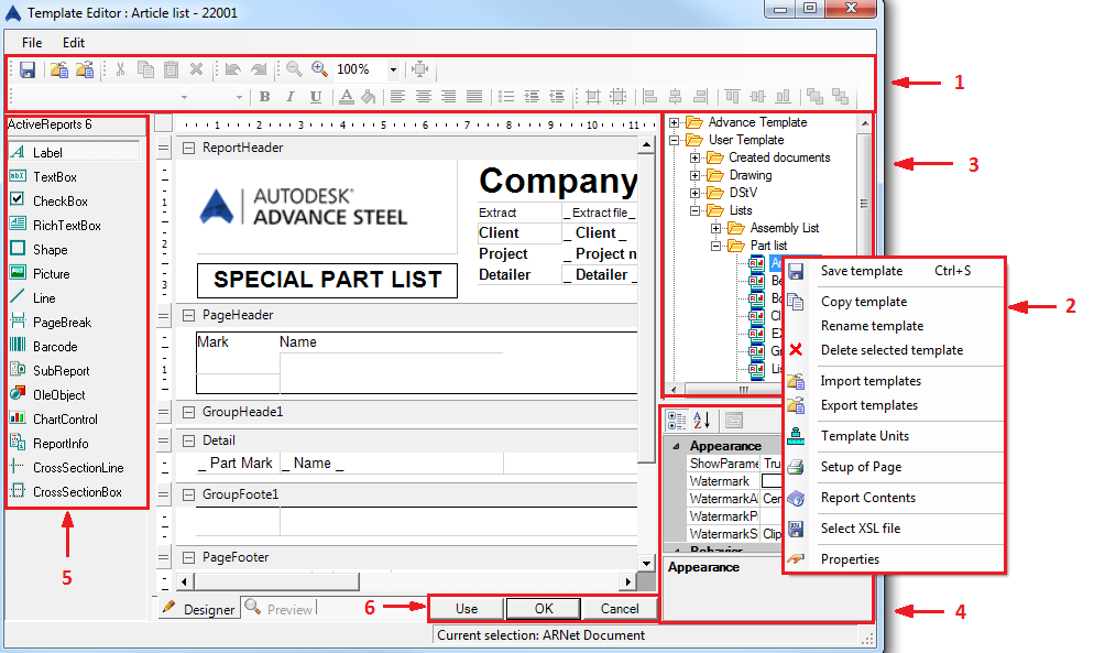 | Use | Applies the selected template. The BOM Editor closes and the list creation begins. |