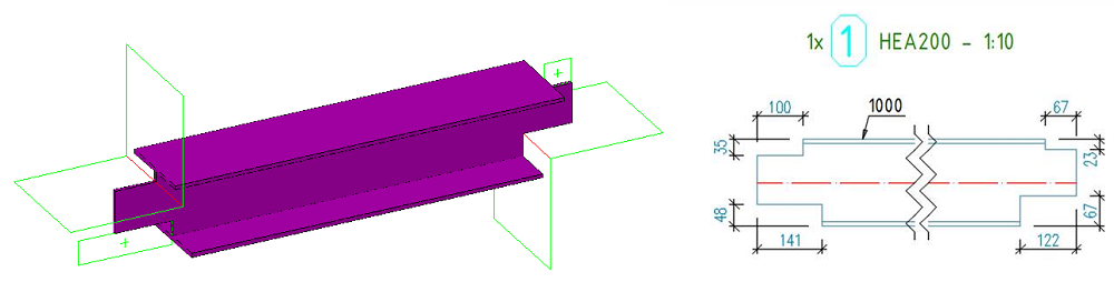 This option creates separate dimension chains for each individual object (the object can be a feature, such as a cut or a cope or it can be an attached beam or plate) on the drawing. Use this option to also automatically arrange the dimensions on the corresponding side of the targeted objects.