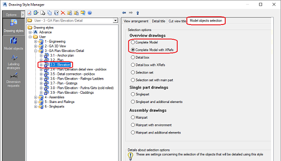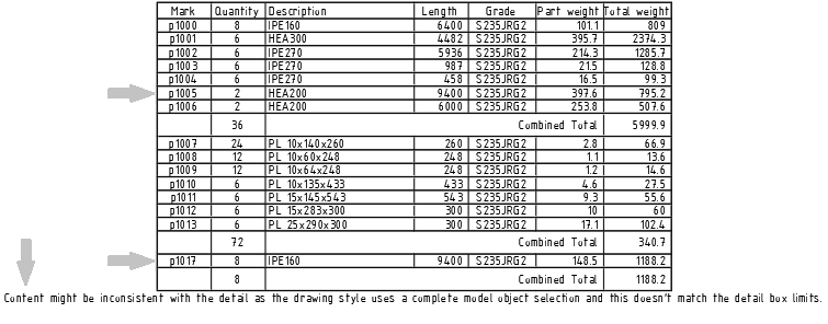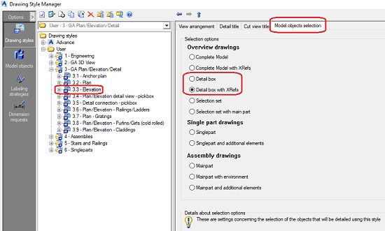 In case of a partial overview that has been created using a drawing style using the Complete model or Complete model with Xrefs options in the Model objects selection (from the Drawing Style Manager), the bills of material created on this view will contain all the objects from the model, not only the ones included in the Detail box.
