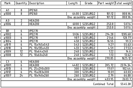 The quantities shown in the list for single parts are total quantities. In case of a partial overview, the quantity displayed in the list for each single part will be the total quantity existing in the model for that part, even if not all these identical objects are present in the view.