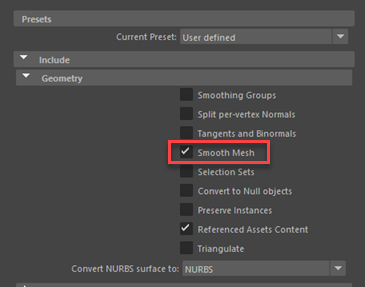 In the Edit export preset window, click Geometry and ensure that Smooth Mesh is turned on.