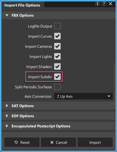 In the Import File Options window, select FBX Options from the list.