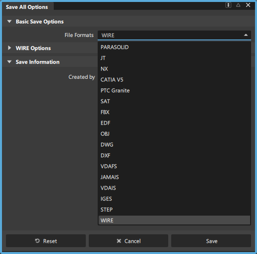 The options window displays different options based on the file format you choose. Some file formats, such as OpenInventor, have no options.