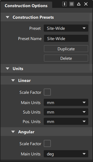 The construction option settings default to those in the construction presets file on the network. These construction presets cannot be edited