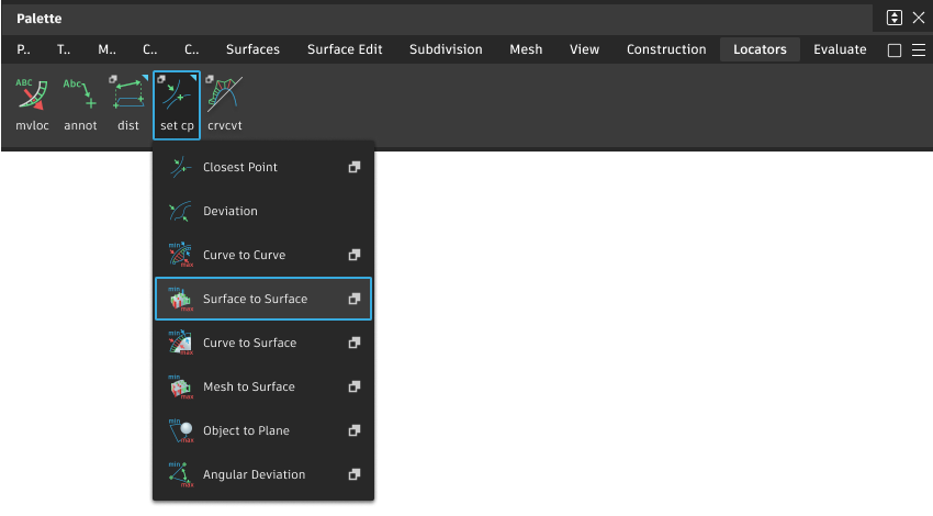 Adds a measurement showing the minimum and maximum deviation between two surfaces. This tool creates a locator showing the deviation between the two objects, labeling the minimum, maximum, and mean.