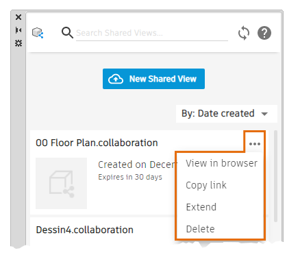 Initiates the process creating a new shared view. Displays the Share View dialog box providing several options. Next, data is extracted from the drawing to create a view, and this view is temporarily posted on a location in your Autodesk Web & Mobile Account, and a link to that location is generated, which you can share.