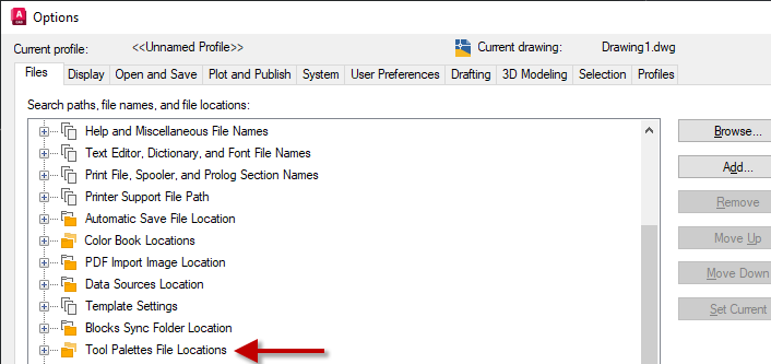 Tool palette files contain standard and user-defined tools. The files are stored in the locations specified by the Tool Palettes File Locations setting.