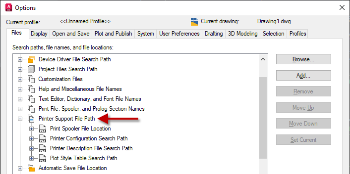 • Plotter Configuration (PC3) Files. Identifies the electronic formats and devices available to output a drawing. The PC3 files from a previous release are migrated to a subfolder named after the release in which they were migrated; the naming convention of the subfolder is Product Name PC3 Files. The subfolder is created to maintain compatibility with both the previous and current product release. The Product Name PC3 Files subfolder is created under the location defined by the Printer Configuration Search Path setting.