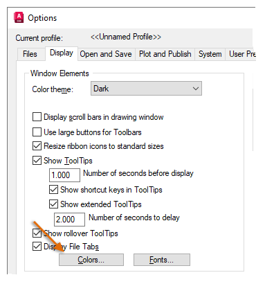 Customizes the program settings. Use the Drafting tab to change the color and font used by the Command Line window