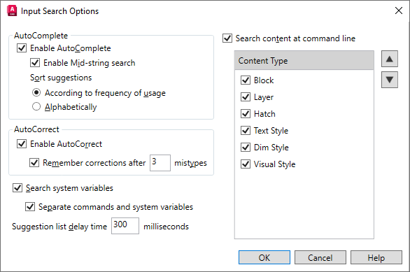 AutoComplete allows you to quickly find a command, system variable, or named object based on a list of suggestions. The items shown in the AutoComplete Suggestions list can be filtered by entering one or more letters at the Command prompt. By default, the suggestions listed either start with or contain the letters as you type them.