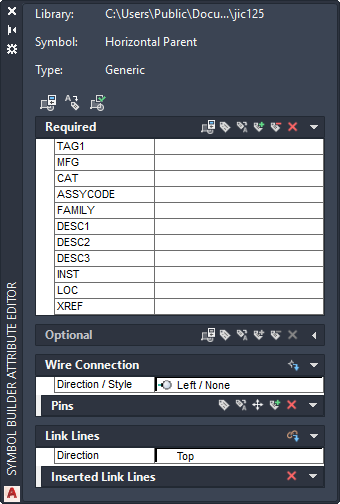 Start from scratch or use an existing symbol that is similar as a starting point. Select the symbol type, insertion point, and orientation. It is recommended for schematic symbols to create both a horizontal and vertical version. Symbol Builder works in the AutoCAD block editor environment. Use the Symbol Builder Attribute Editor palette to insert the necessary attributes for the selected symbol type.