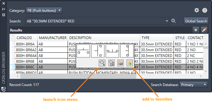 If the symbol you need is not yet associated to the catalog number, you can open the icon menu directly from the catalog browser to insert it. The symbol becomes associated to that catalog number from that point on. If it is a catalog value you plan to use frequently, add it to the favorites.