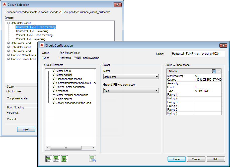 Use Circuit Builder to insert motor control and power feed circuits. Select from various circuit options. Find