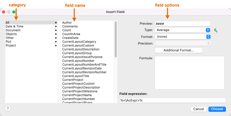 In the Insert Field dialog box, select a category and a field name.