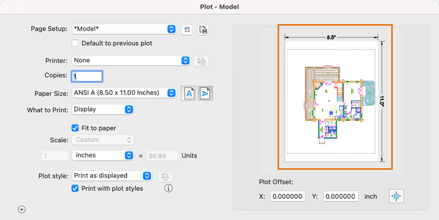 A preview area is available making it easy to see how your drawing will appear when plotted.