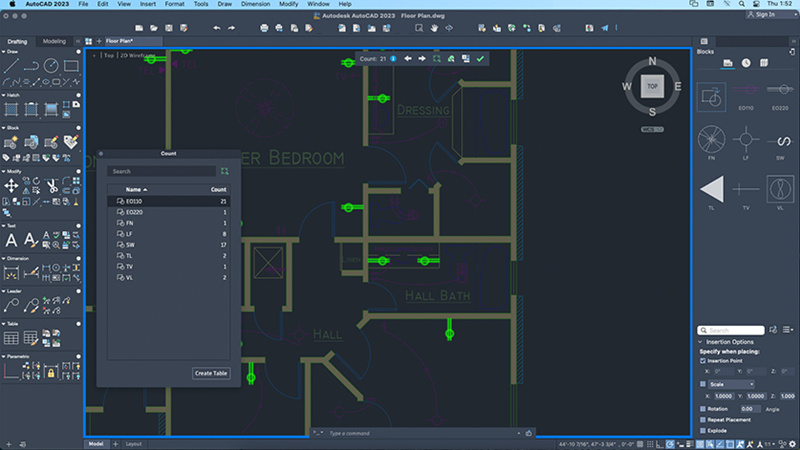 Quickly and accurately count the instances of objects in a drawing. You can insert a table with the block count data into the current drawing.