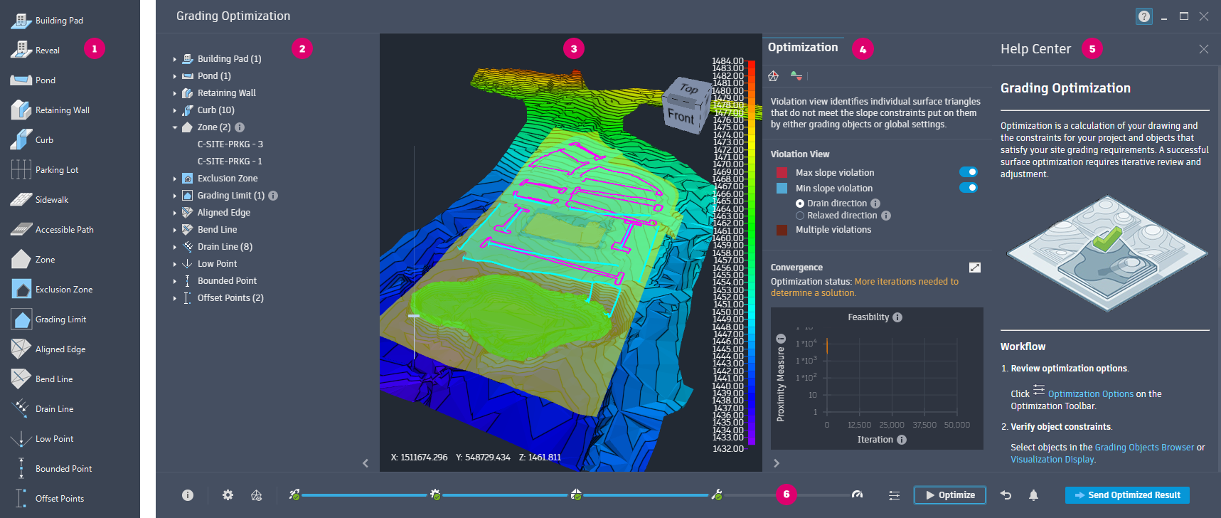 Help Center - This panel provides in-context guidance as you work in Grading Optimization. Workflows, example drawings, and links to relevant learning content are also available.