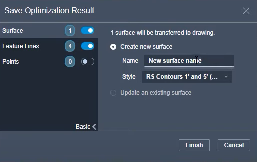 To send the graded surface to Civil 3D, click the button Send Optimized Result button from the bottom toolbar. In Civil 3D, you should see a new window appear. The optimized surface can be transferred to the drawing as a new surface or it can update an existing surface.