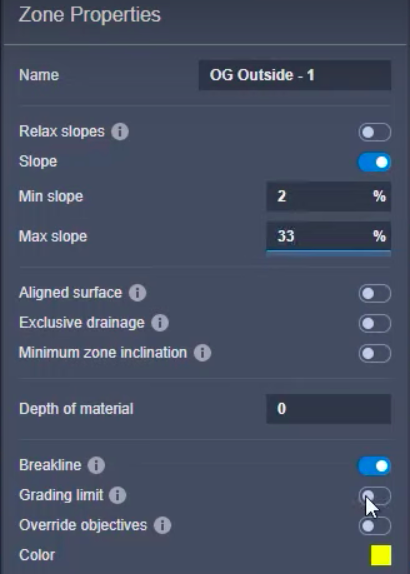 Grading Object Tool Palette - This tool palette in Civil 3D allows you to tag drawing elements as grading objects for optimization. Each object listed contains default constraint data. You can right-click any object tool to edit the default values applied when used, or create additional customized objects.