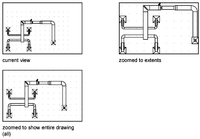 ZOOM All displays either the user-defined grid limits or the drawing extents, whichever view is larger.