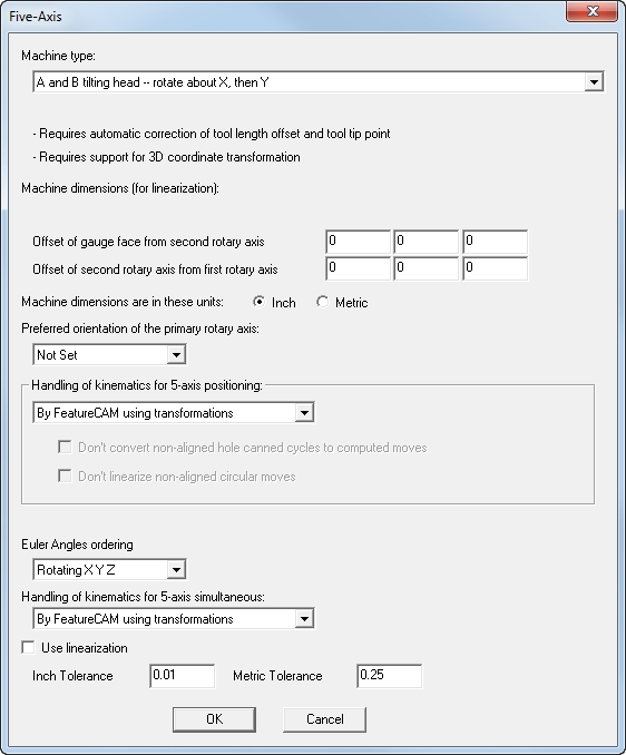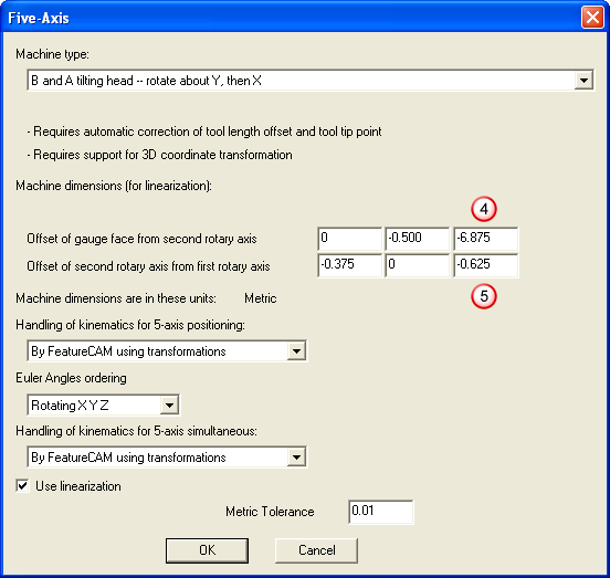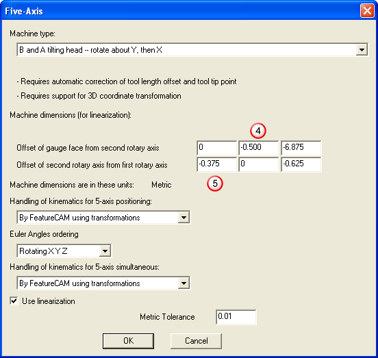 The five-axis dialog for a B and A tilting head machine is shown below. You enter machine dimensions so that
