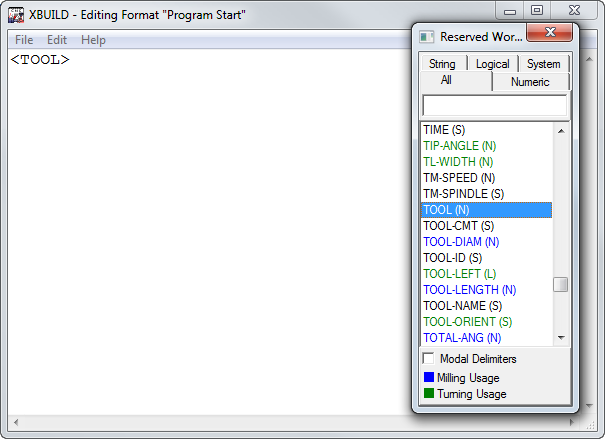 Reserved Word contains the variables that can be used in the type of .cnc file you are currently working with. Use it to quickly update the format you are editing.