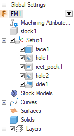 The Part View panel displays a hierarchical view of the part. Each Setup is listed with each of the features of the Setup listed below. From this view you can select, show, hide, or edit features.