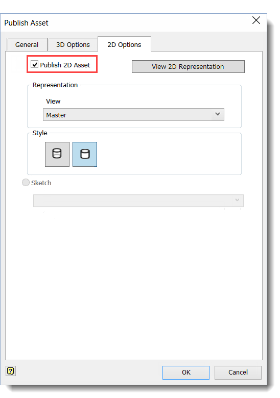 - Click the 2D Options tab and make sure that the Publish 2D Asset check box is enabled. This setting ensures that the asset gets published for use in AutoCAD Factory.