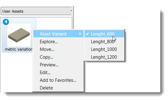 - Right-click over metric variation to display the pop-up context menu. Observe the four defined variants in the Asset Variant submenu.