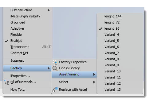 Once an asset variant is placed in a layout (whether in AutoCAD Factory or Inventor Factory), it can easily be replaced with a different variation.