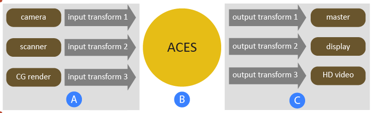 | B | Input Device Transforms (IDTs) convert images to ACES. IDTs may be supplied by device vendors, software vendors such as Autodesk, other third parties, and AMPAS itself. In addition, you can author your own.
