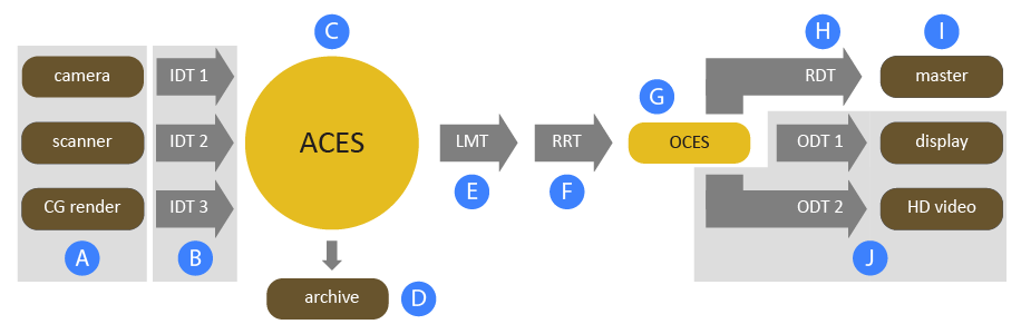 | J | Different output device transforms (ODTs) are applied to prepare the images for display on other devices. As with IDTs, the ODTs may be supplied by device vendors, software vendors such as Autodesk, other third parties, and AMPAS itself. |