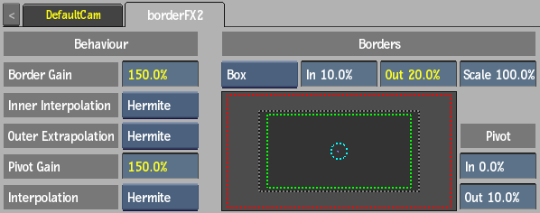 Use the Border FX settings to control how the lens flare behaves when it reaches the borders of your image. A visual representation of the inner and outer borders, as well as the pivot area is displayed in the menu.