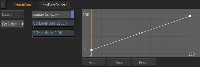 - Displays the transparency value at which objects start occluding the flare. Editable.