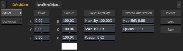 - Displays the colour of the attached flare components (based on the colour of the attached light). Editable.