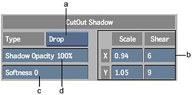 (a) Paste Mode box (b) Scale and Shear fields (c) Softness field (d) Shadow Opacity field