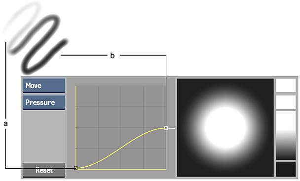 Pressure is mapped along the horizontal axis (X-axis) of the curve, and the amount of paint applied is mapped along the vertical axis (Y-axis). If you are using the default S-shaped curve and you press lightly on the pen, very little paint is applied. As you press harder, more paint is applied.