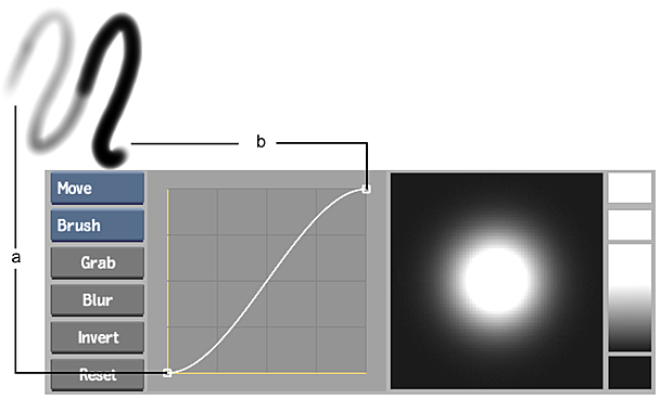 Adjust the pressure profile to change the amount of pressure needed to paint with a given brush. The slope of the curve indicates how quickly paint is applied as you press on the tablet. If the curve is steep, a small amount of pressure applies full paint to the canvas. If the curve is soft and rounded, you must press harder and longer to apply full paint.