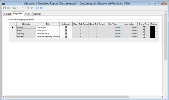 The Properties page is used to define the display properties of the Y-axis and the graph for Observed / Predicted reports. For all other reports, the Y-axis and graph properties are specified in the Layout Page.