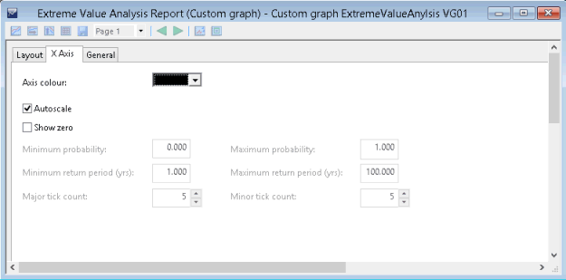 The layout page for both flexible and extreme value analysis styles is very similar. Multiple graphs can be plotted per page, and trace styles and scaling options can be set in this page.