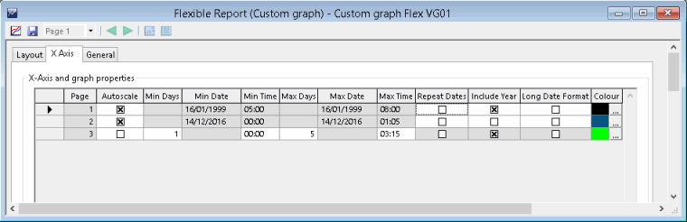 For these types of reports, the X Axis page consists of a grid containing the date/time ranges for each of the pages of the graph report. Each grid row’s date/time range corresponds to the union of the time ranges of all the simulations used on that page. Relative time ranges can be contained on some pages and absolute time ranges on other pages.