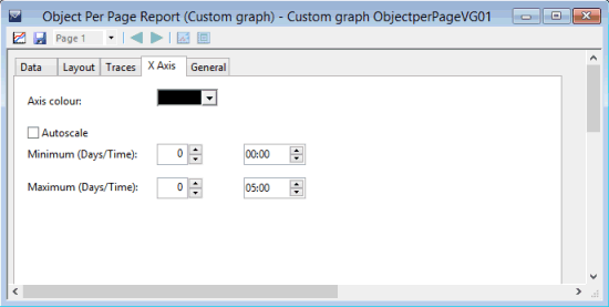 The X Axis page is used to define display properties of the X-axis and the graph. The format of the X-axis page will vary with the style of graph selected. See the sections below for more details:
