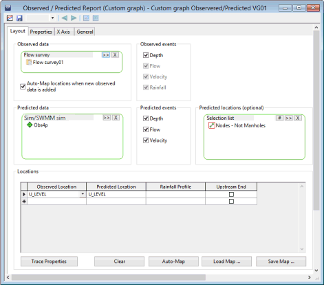 For Flexible reports, on the Layout page, you select which simulations or time varying data (such as a rainfall event) you want to use in the Sims/time varying data box and assign which attributes to plot (potentially different graphs on different pages) from these sims/TVDs in the Trace properties grid. All graphs on the same page (possibly from different sims/TVDs) use the same date/time range along the X-axis.