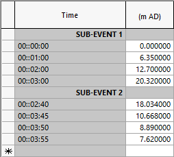 For events, other than rainfall events, the engine that is used for processing SWMM simulations treats all the times in the event, regardless of any division into sub-events, as a constant stream of data. Therefore, each sub-event time must be specified in ascending order, and no sub-event can have overlapping times.