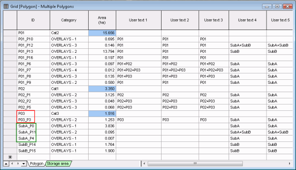 In the screenshot below, for example, P03_P3 polygon is the only polygon derived from original polygon P03. On the other hand, Subcatchment SubA, when intersected, resulted in the generation of 3 different polygons: SubA_P0, SubA_P11 and SubcA_P4.
