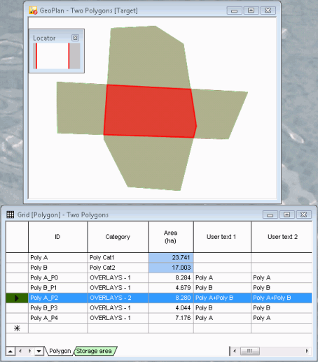As can be seen from the screenshot below, the polygon resulting from the overlap between the two original polygons has been assigned the two IDs of the polygons it originates from and these are appended in the user-text fields (Poly A + Poly B).